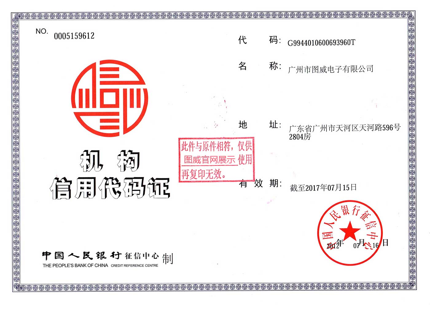 公司簡介 > 榮譽證書 > 圖威機構信用代碼證